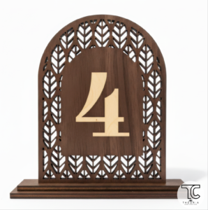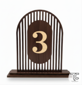 Each table number is thoughtfully designed and laser cut at Theoria Creations, a family-run shop focused on clean design, quality materials, and beautifully crafted details for meaningful moments.